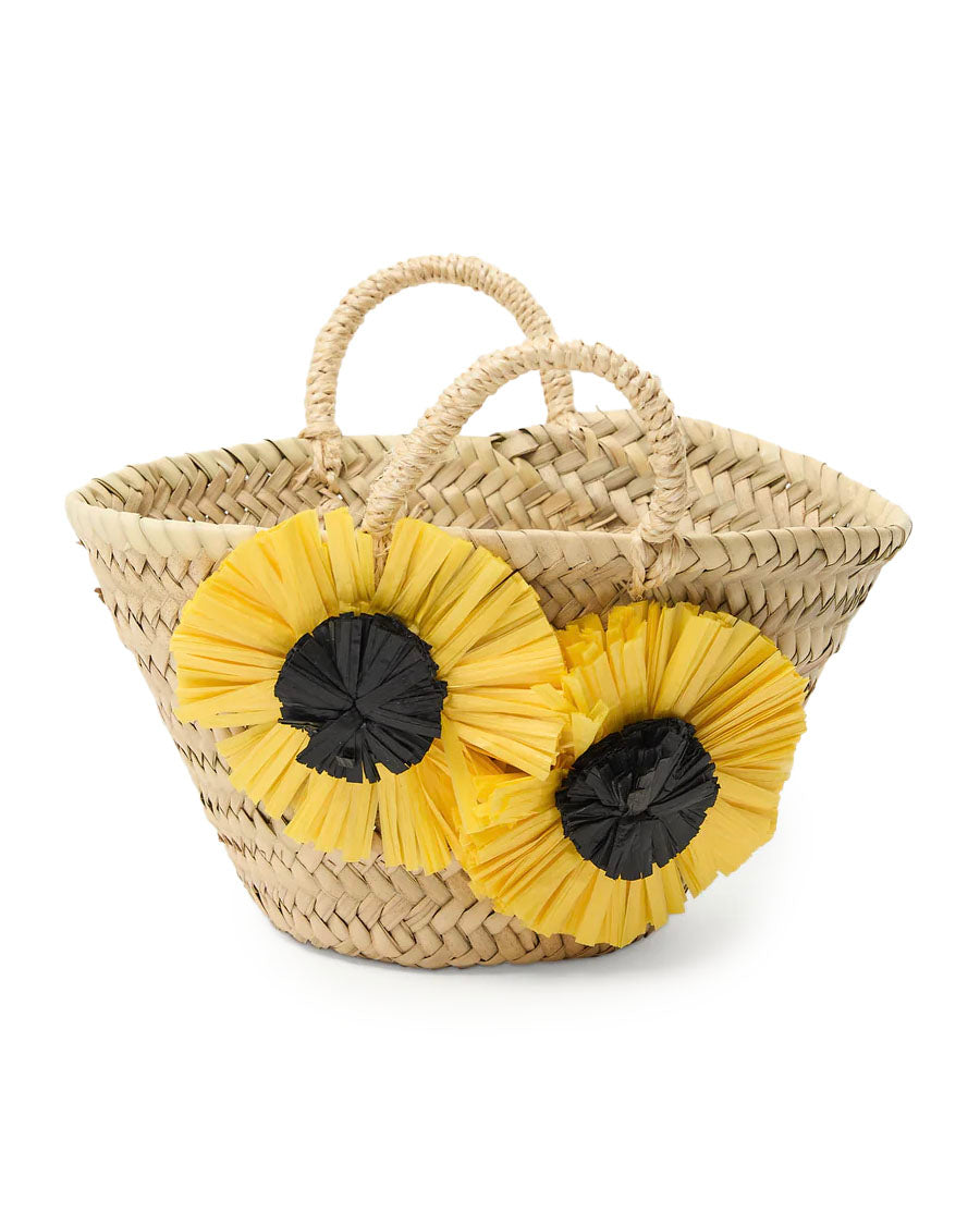 This raffia bag features three bold sunflowers on the front for a fun, summery touch. Lightweight and stylish, it's perfect for sunny days. Made in China.
