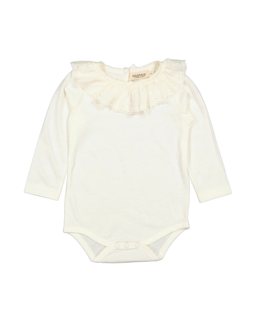 Long-sleeved bodystocking with a round collar and lace details. The bodystocking closes with buttons at the back. The bodystocking is soft, stretchy and comfortable to wear.