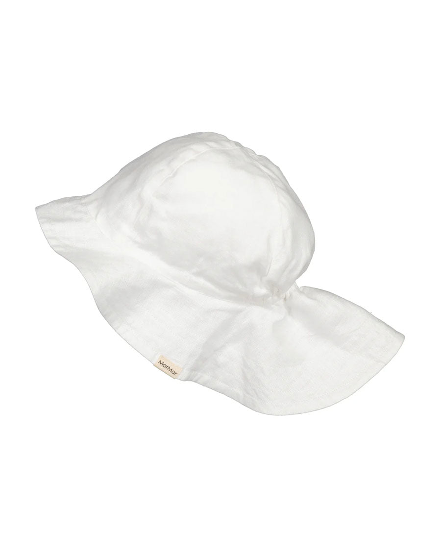 Linen summer hat with a brim and elastic strap under the chin that closes with a button in three lengths.