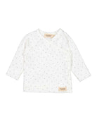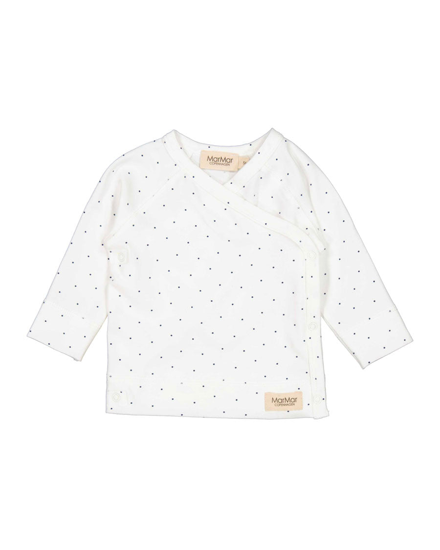 Long-sleeved blouse for newborns with a wrap-around closure and fine stripes. The blouse closes with snaps and is soft, stretchy and comfortable to wear.