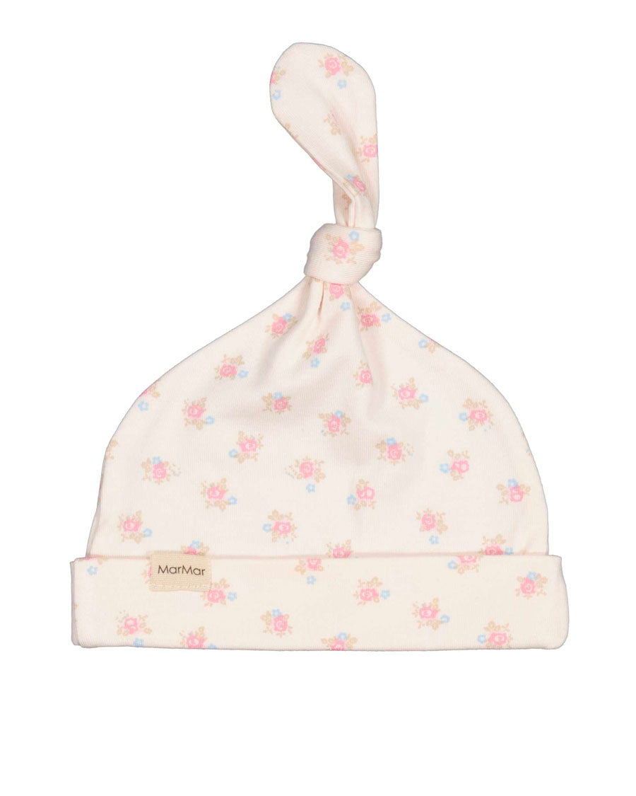 Small hat with little bouquet print for newborns with a brim that can be folded down and a cute knot on top. The hat is soft, stretchy and comfortable to wear.