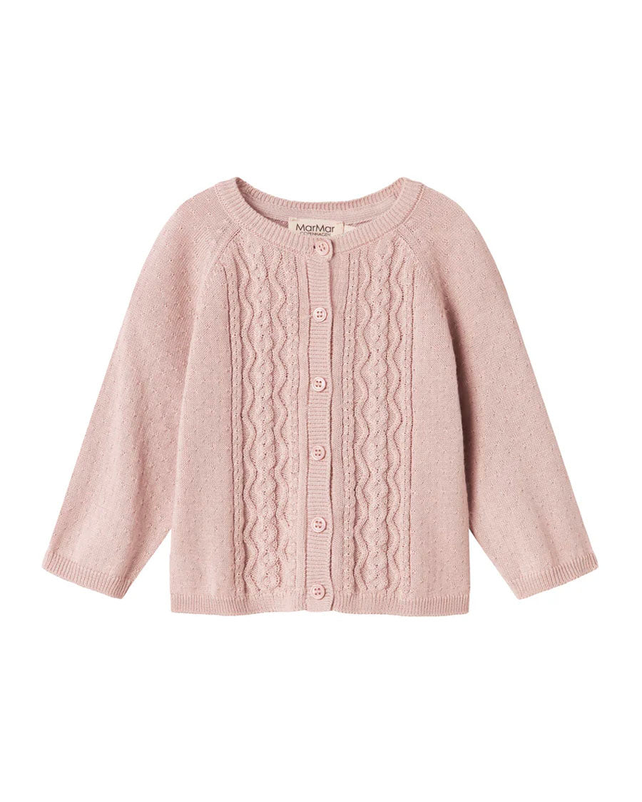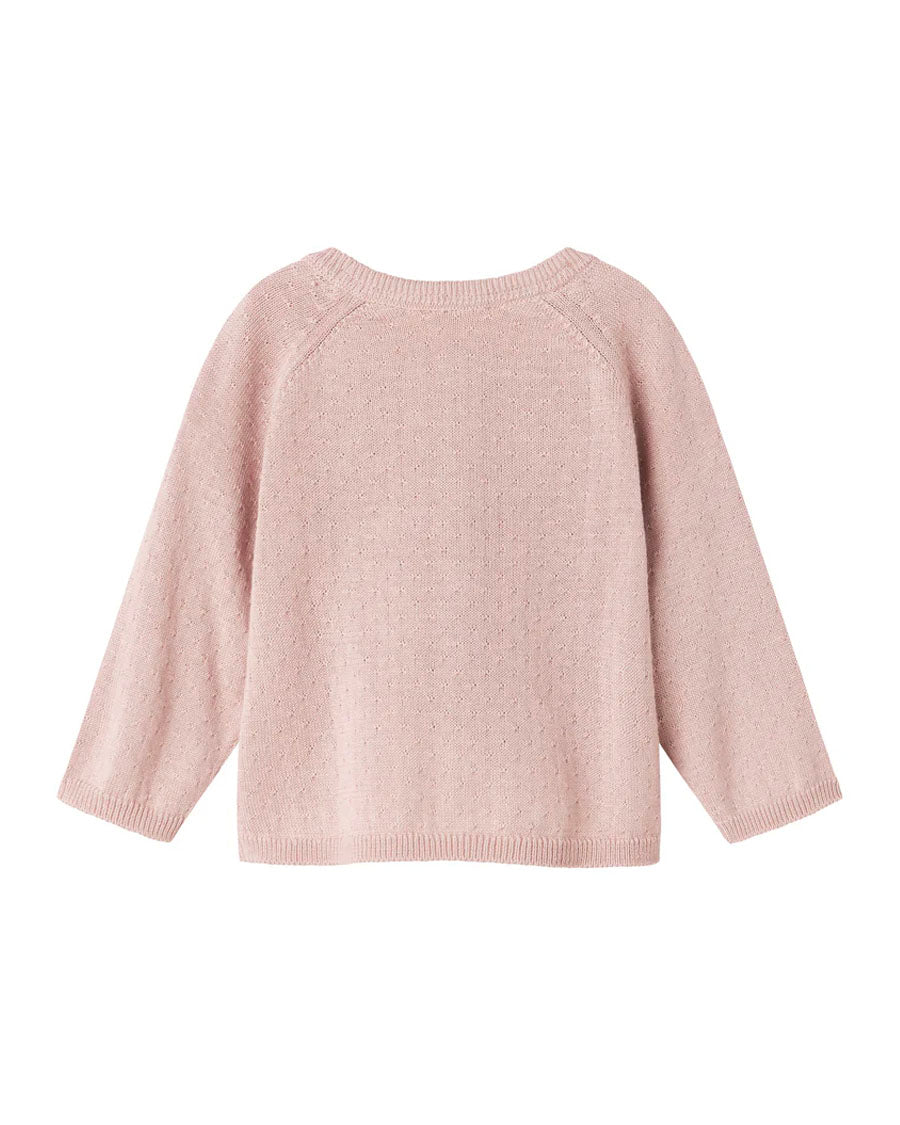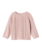 Knit cardigan for the little ones with raglan sleeves, delicate lace pattern and beautiful cable details at the front. The cardigan has a round neck, button closure and ribbed edges at the sleeves and bottom. The cardigan is perfect for both everyday wear and festive occasions.