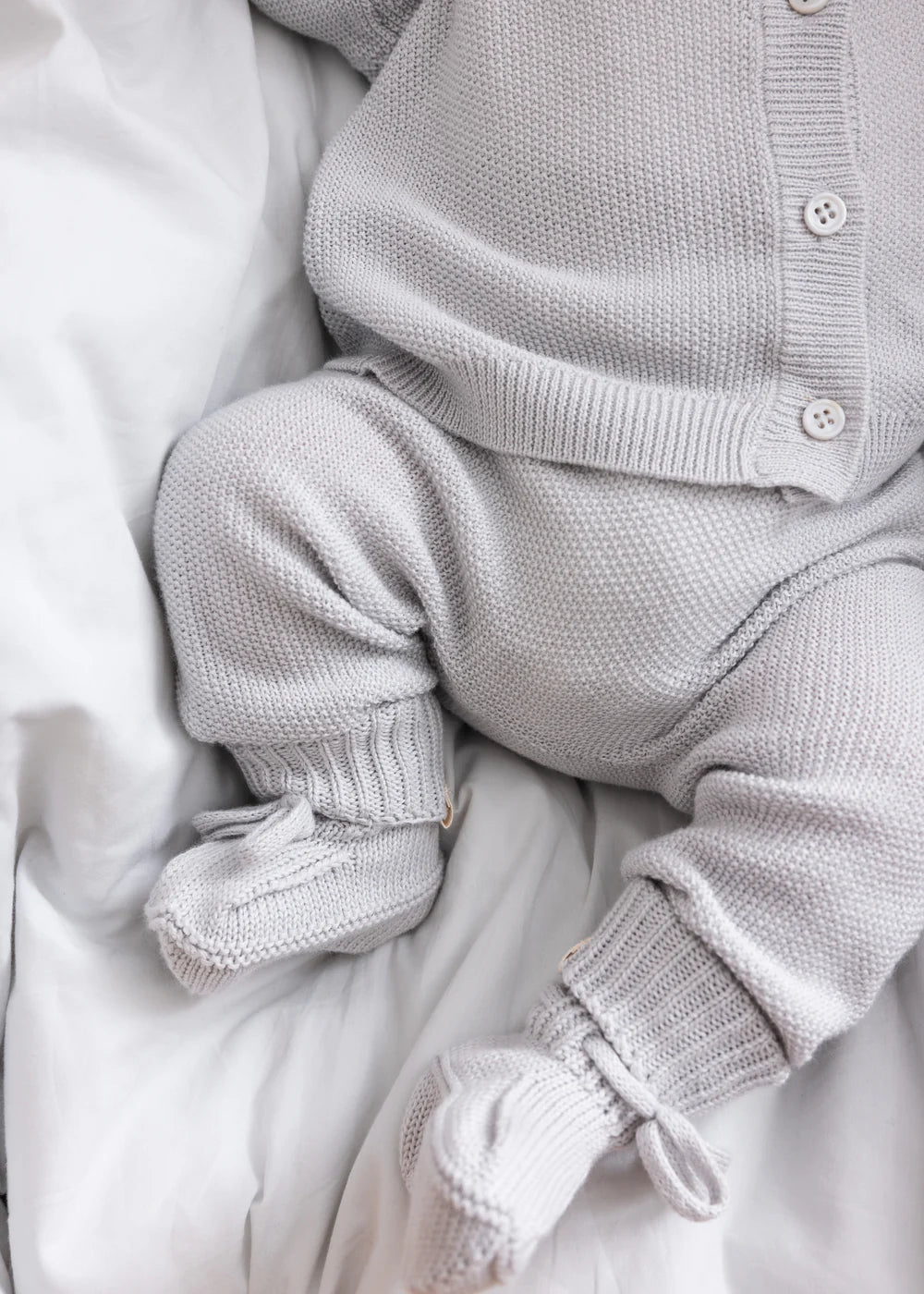 Knitted pants for baby with elastic waist. The pants are knitted in a dense, structured pearl knit. The pants are both warm and comfortable to wear.
