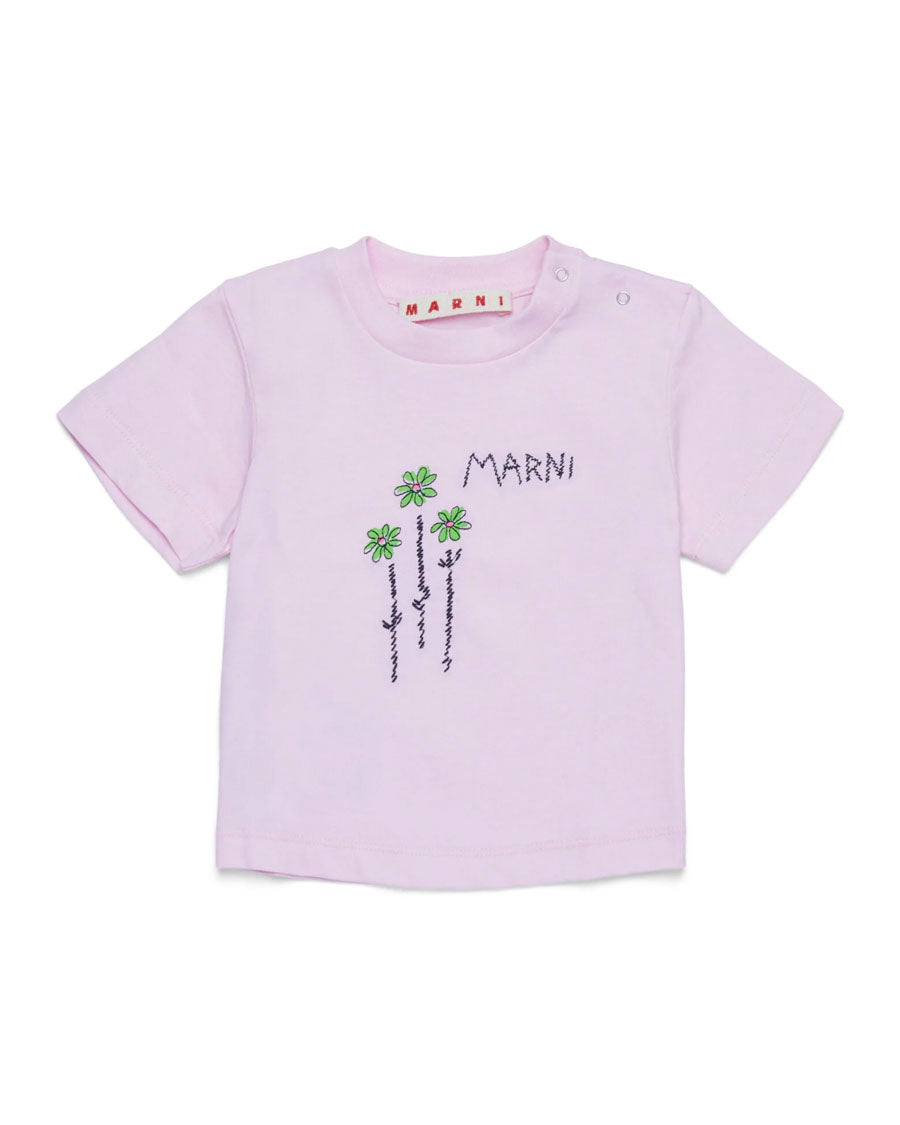 Short-sleeved crew-neck T-shirt in jersey. It features embroidered flowers on the front accompanied by the lettering Marni. Practical snap button closure on the shoulder. Made of 100% cotton.