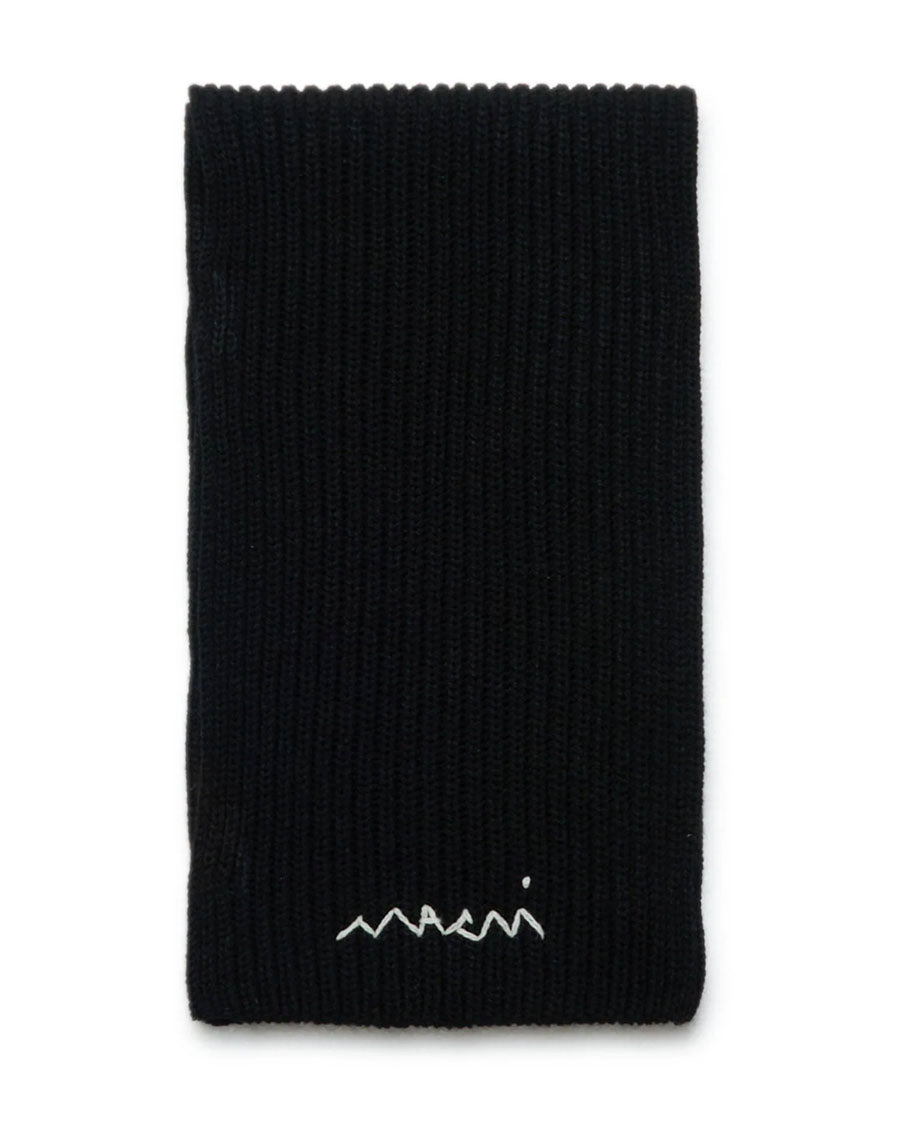 Rib-knit wool-blend scarf embellished with handmade Marni logo embroidered in contrasting color. Soft and snug, perfect for protecting from the cold with a touch of elegance and authenticity.