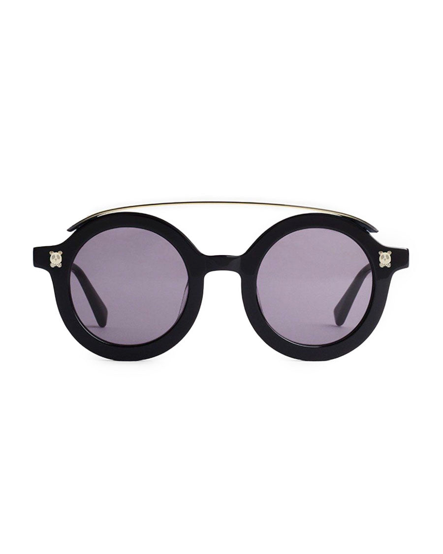 UV-protective sunglasses made from handmade plant based bio-acetate. Designed with an attched visor on top and black lenses. The glasses are decorated with golden Mini Rodini Pandas inlaid into the front of the frame and a Mini Rodini logo on the inside of the left temple. The sunglasses block all harmful UV-rays and are constructed with five barrel hinges. Delivered with a Mini Rodini branded faux leather hardcase. Fits children aged 3-7.