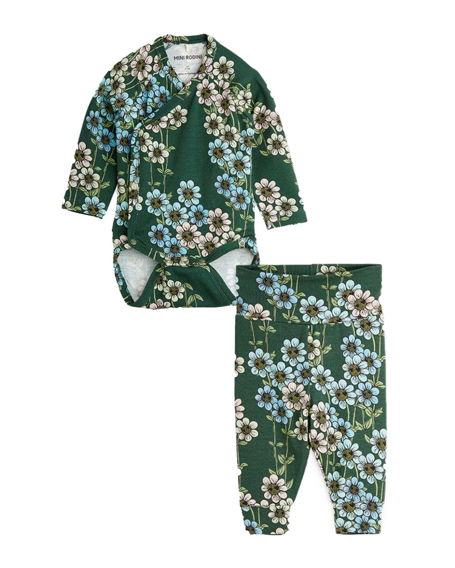 Bundle for newborns with a wrap bodysuit and a pair of leggings in TENCEL™ Lyocell with stretch. The body is designed with snap buttons along the front, and the leggings feature elastic leg ends and a folded waist which can be unfolded as the child grows.