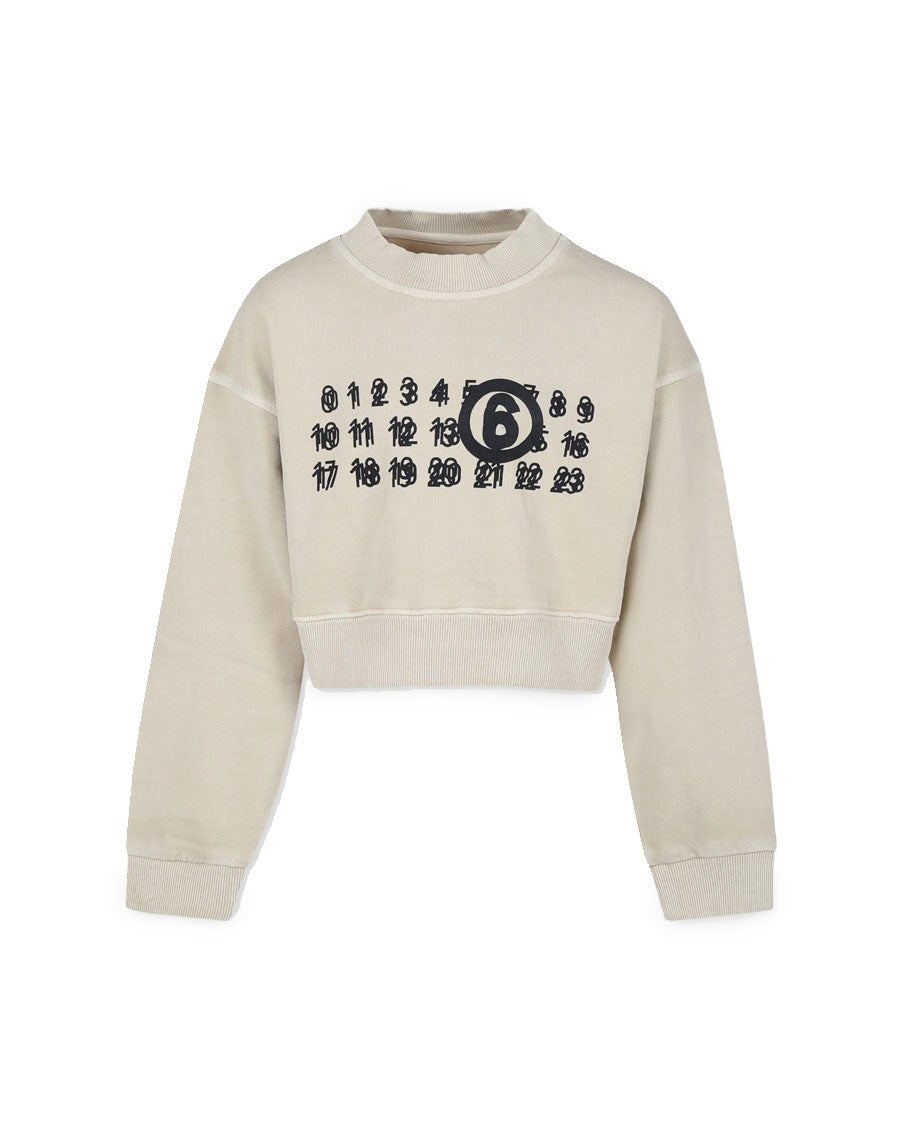 Beige short sweatshirt in brushed cotton, long sleeves, with ribbed round neck, cuffs and hem. It is decorated with a three-times printed logo, with a washed effect, on the front. This garment is made with special printing techniques, which makes the garments unique and different. Details: 100% Cotton. Wash at 30°C.