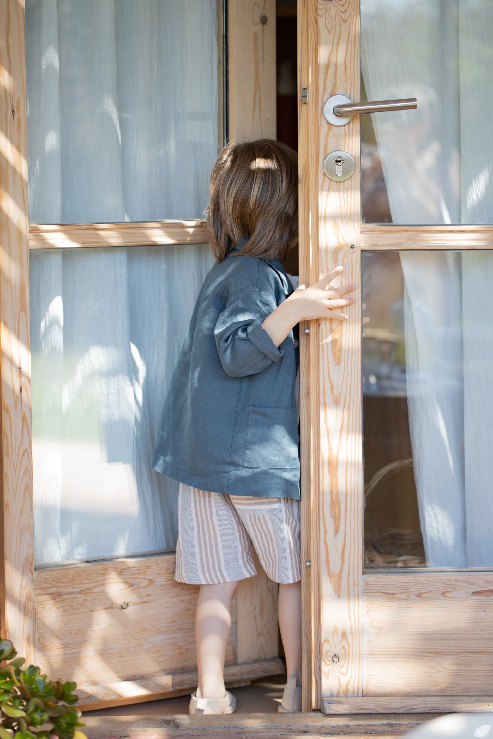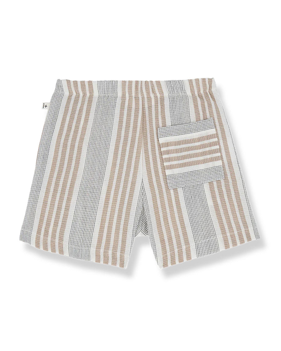 Striped airy bermudas. Features elasticized waistband, decorative waist tie with leather look detail, side pockets, one back pocket in a relaxed fit. Pair with this tee or this polo for a cute outfit.
