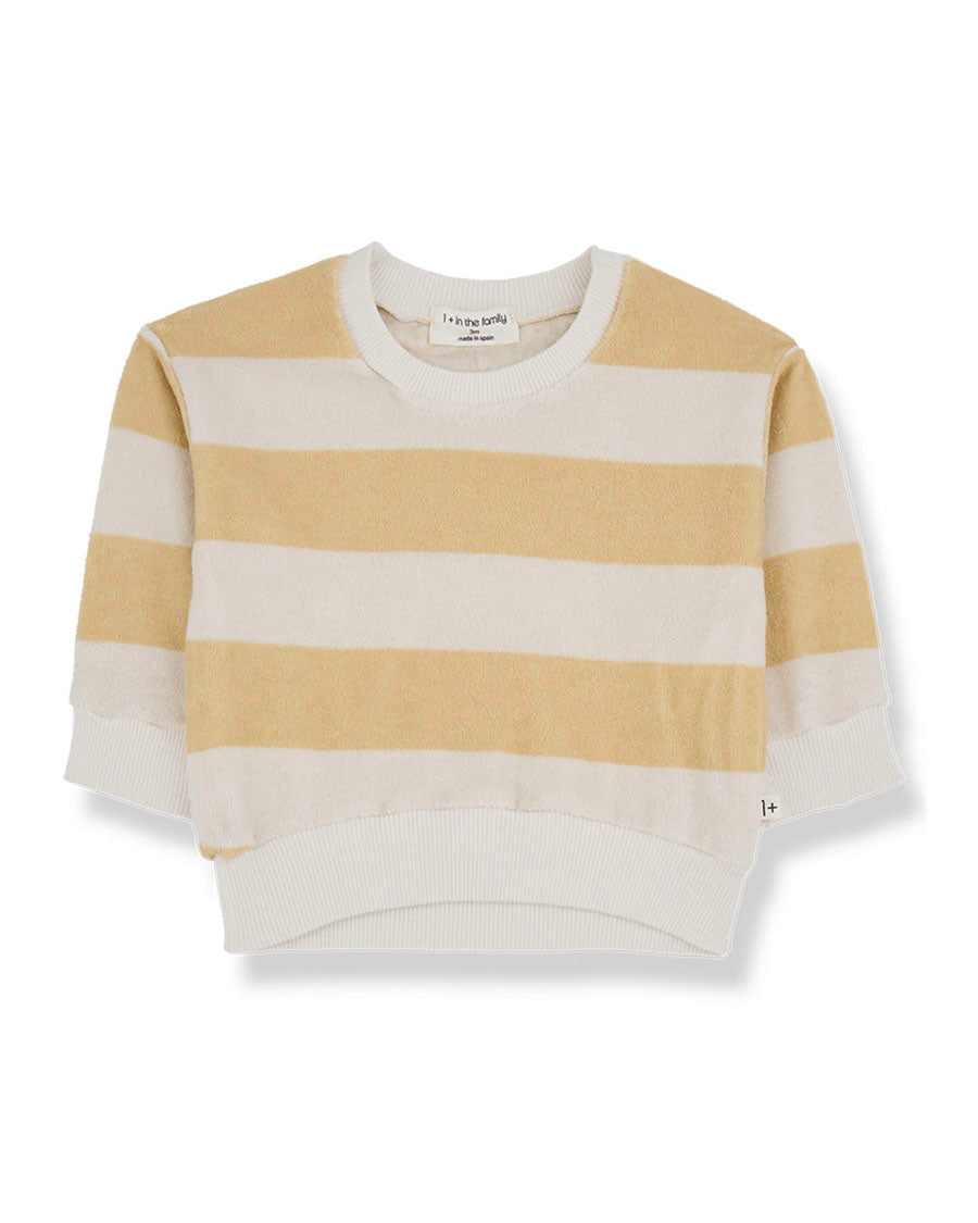 The Stefano Sweater from 1+ in the Family. A cozy and stylish baby sweater with wide peach and off-white stripes, featuring a soft ribbed neckline, cuffs, and hem for a comfortable fit. Perfect for layering in cooler weather.