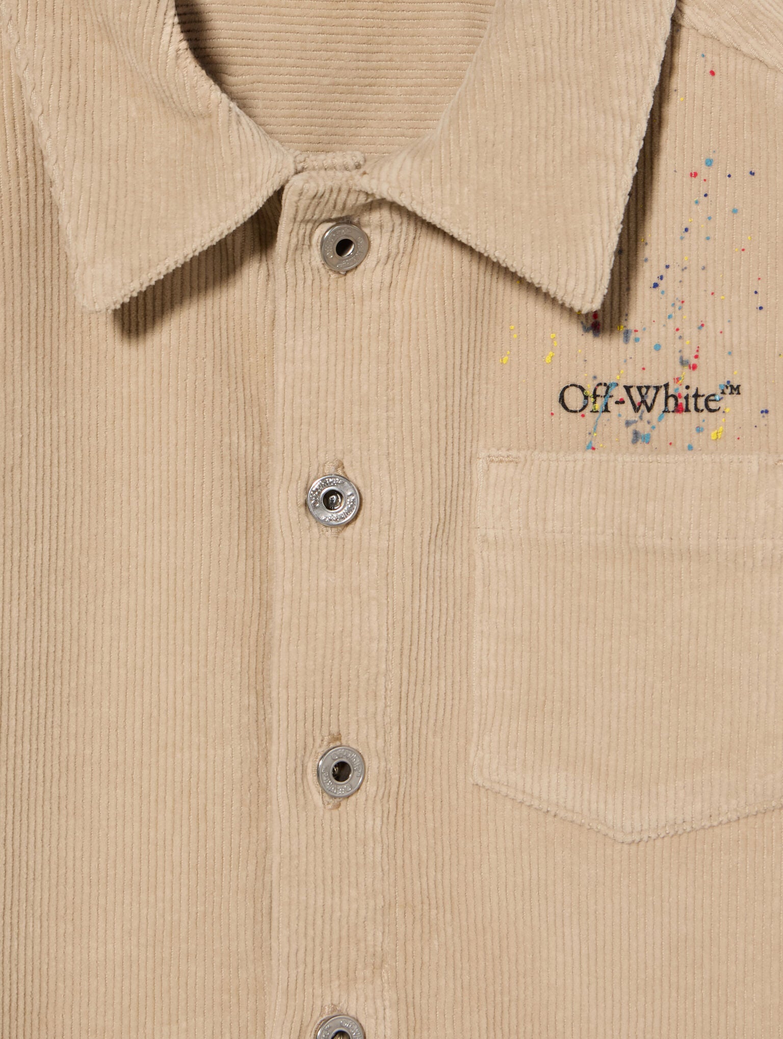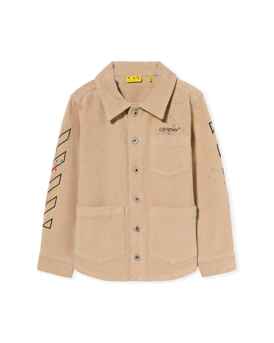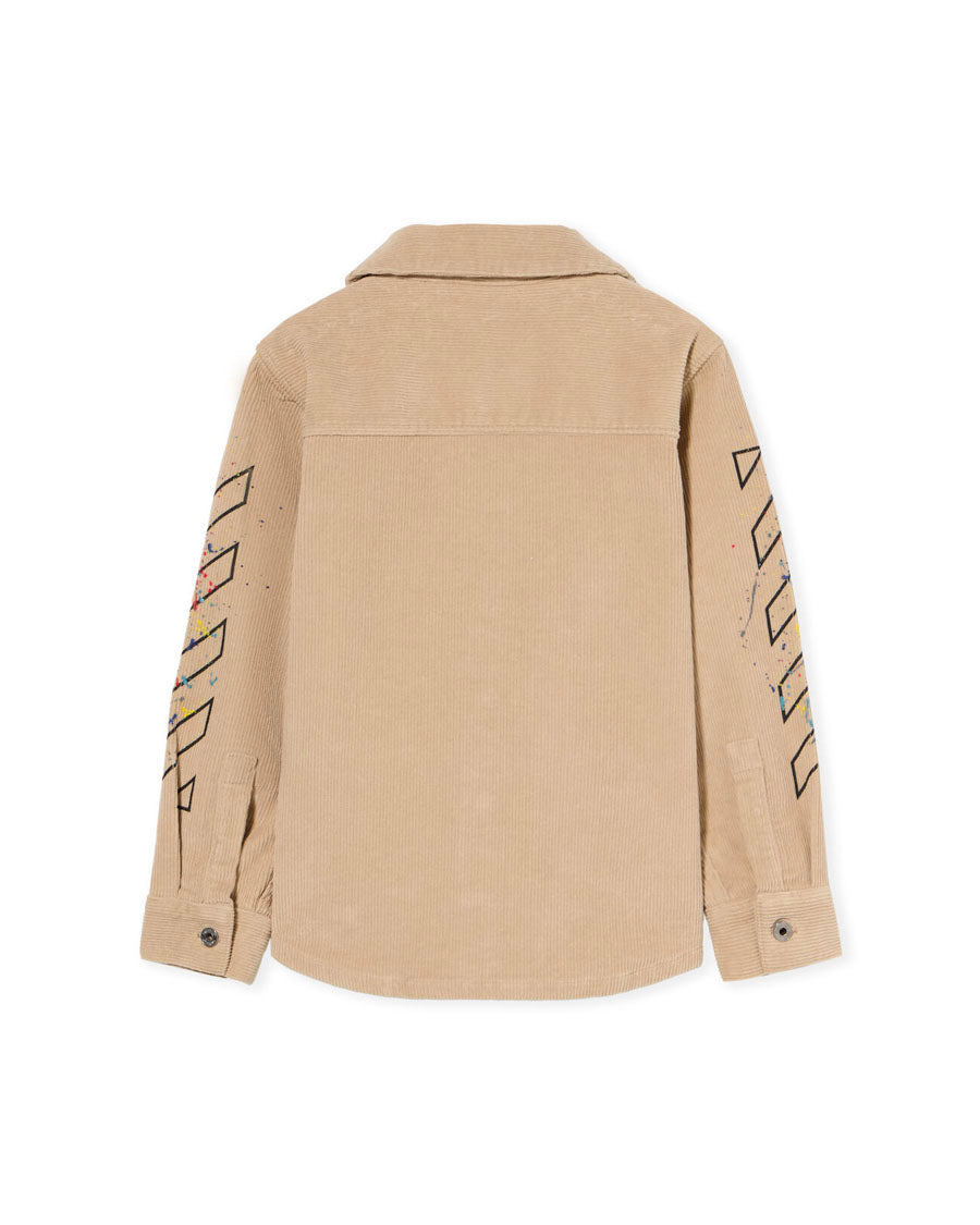 This corduroy jacket features a structured silhouette, adorned with signature diagonal splat motifs, offering a distinctive urban aesthetic.