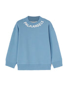Logo in different touch-and- feel versions. Boy's dusty blue sweatshirt with white screen-printed logo around the neck.