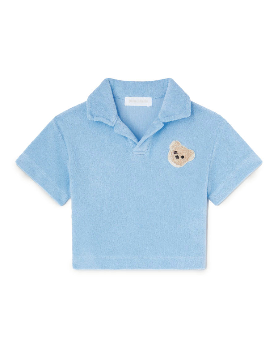 An icon of kids and Palm Angels, the teddy bear returns in different versions and identities. Newborn baby boy's light blue terry polo shirt with brown teddy bear patch to the front.