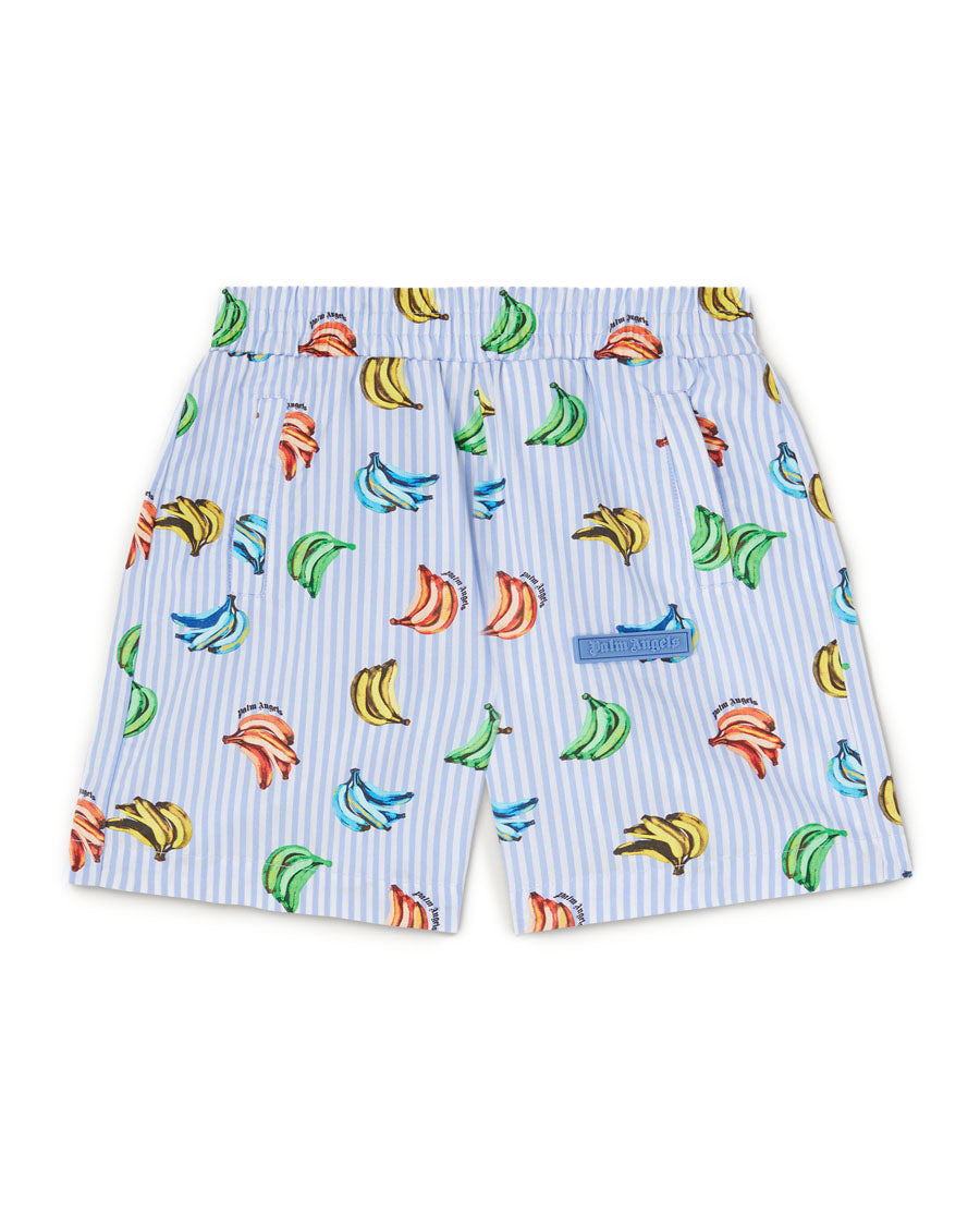 Wearing SS25 bananas pop print is pure fun. Boy's vertical striped shorts with elastic waistband and with all over print of multicolored bananas and blue silicone patch with embossed logo.
