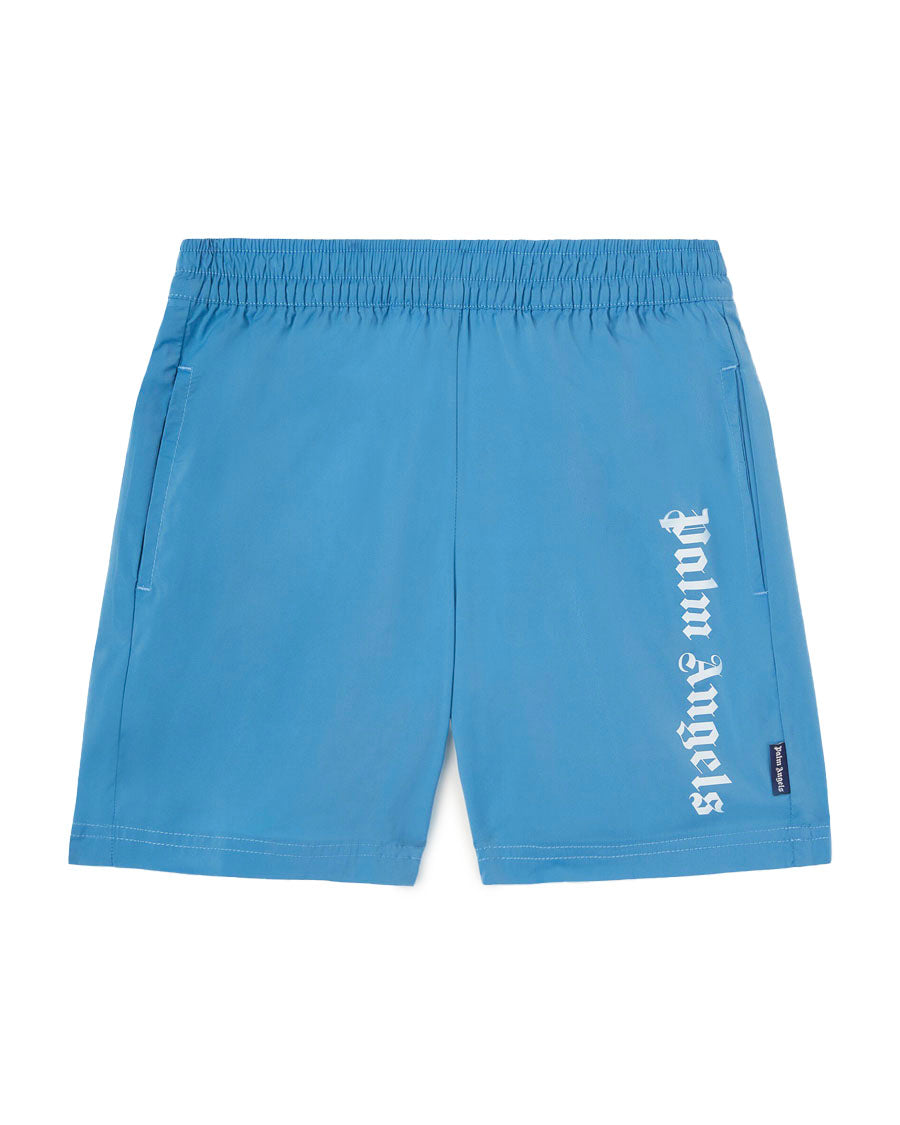 Different logo positions and sizes add a contemporary twist to classics. Boy's dusty blue swim shorts with elastic waistband and Over logo printed in white vertically on the left leg.