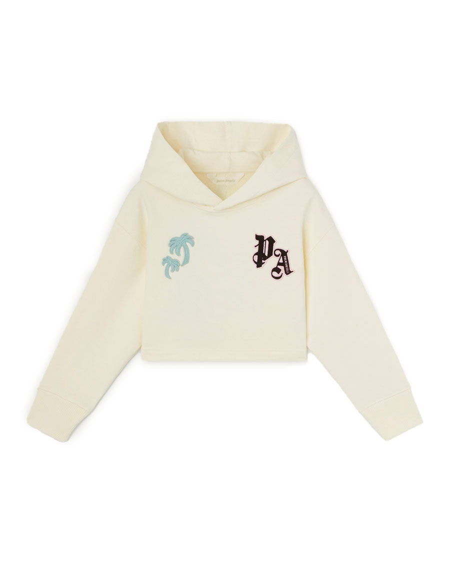 A mix of sporty details and Hawaiian botanicals to create a new team spirit. Girl's butter color cropped hoodie with Monogram printed in black on front left and palm trees printed in light blue on the right. On the back, Team Palm Number 10 in black embellished by light blue Hibiscus and with Curved logo printed in black on top.