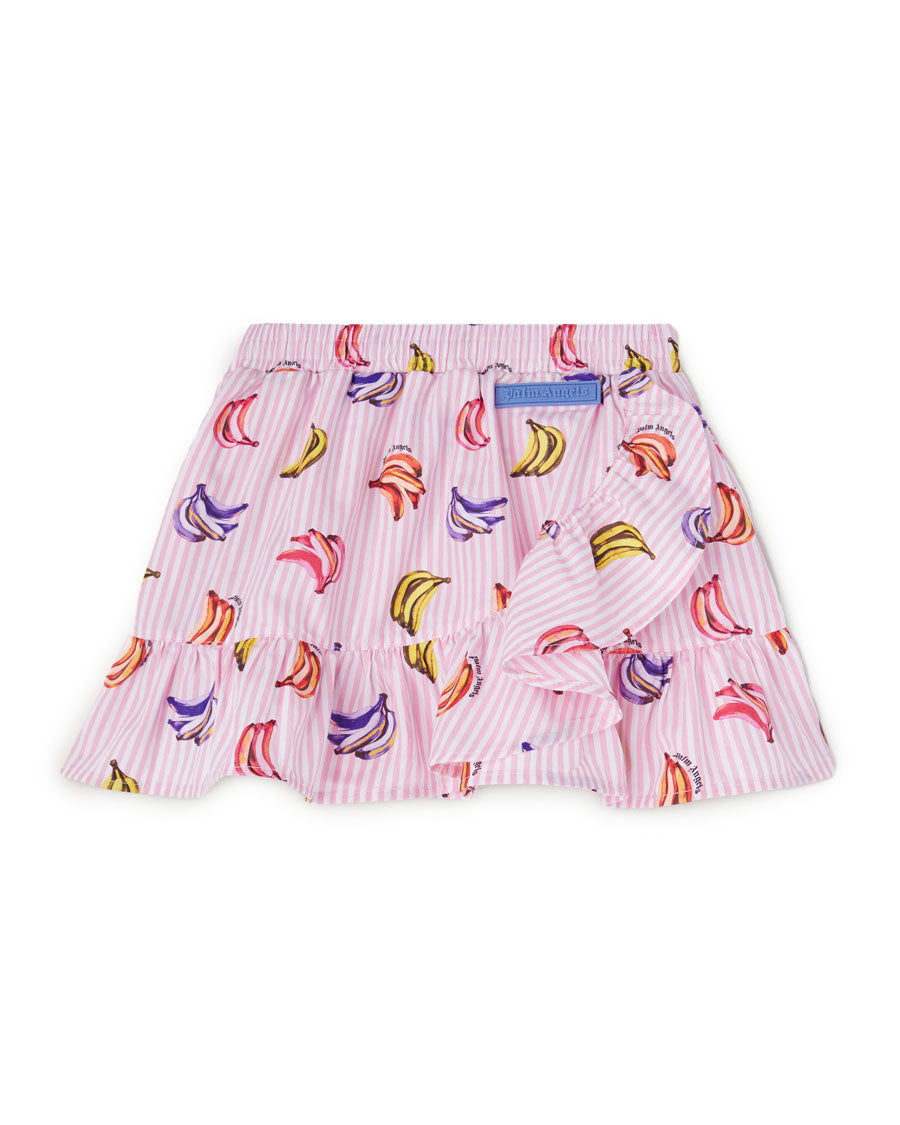 Wearing SS25 bananas pop print is pure fun. Girl's vertical rose pink striped mini skirt with all over pattern of multicolored bananas and blue silicone patch with embossed logo on the front.