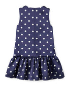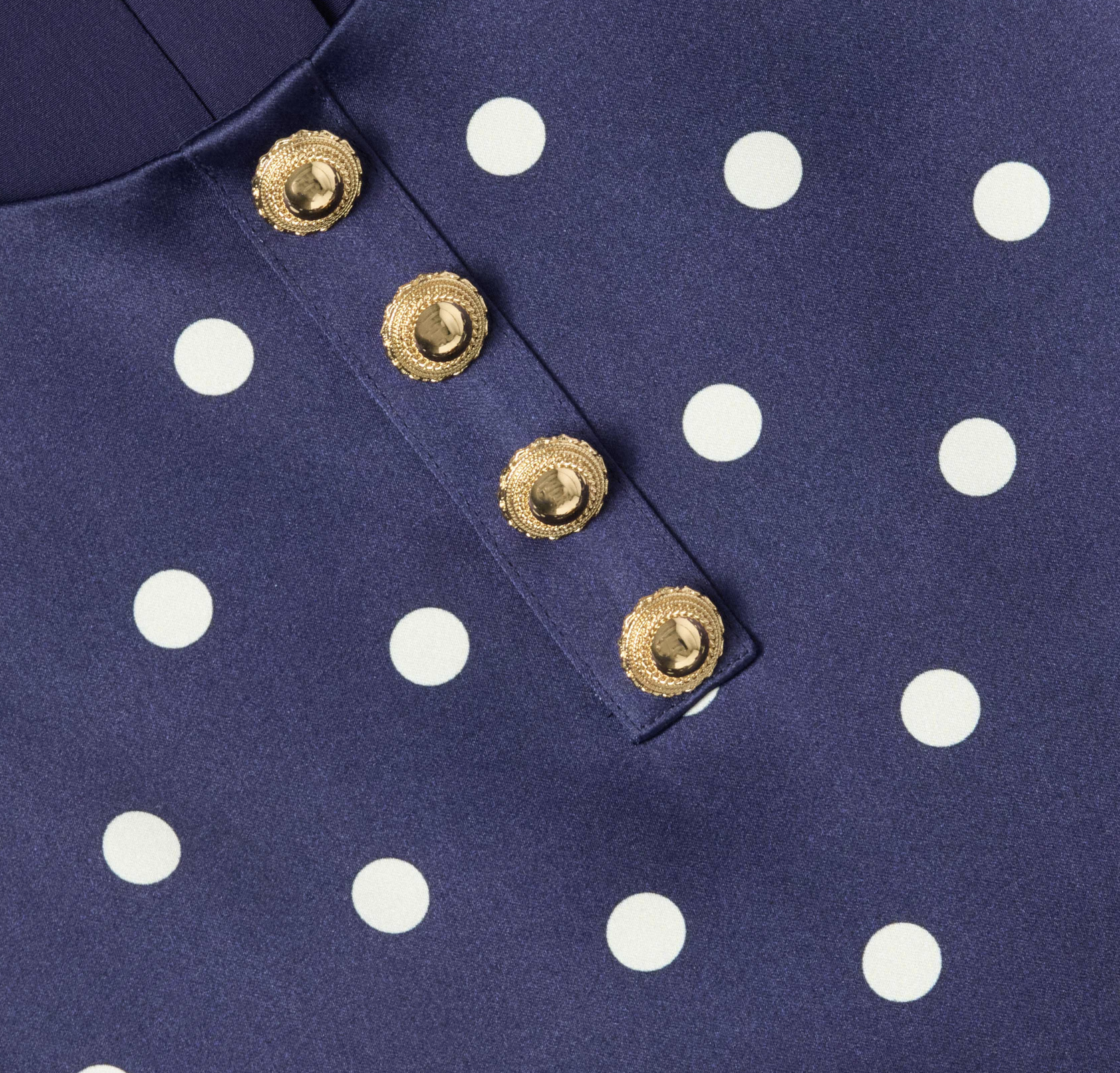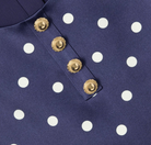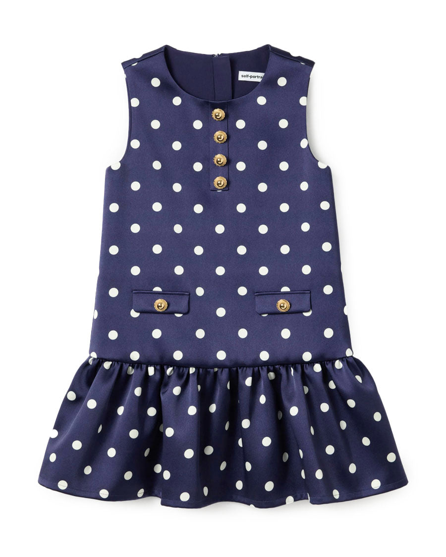 A polka dot print brings a playful touch to this mini dress, cut from taffeta for its smooth shine. Accented with gold buttons and a frilly, flared hem – add sparkling flats for a birthday party.