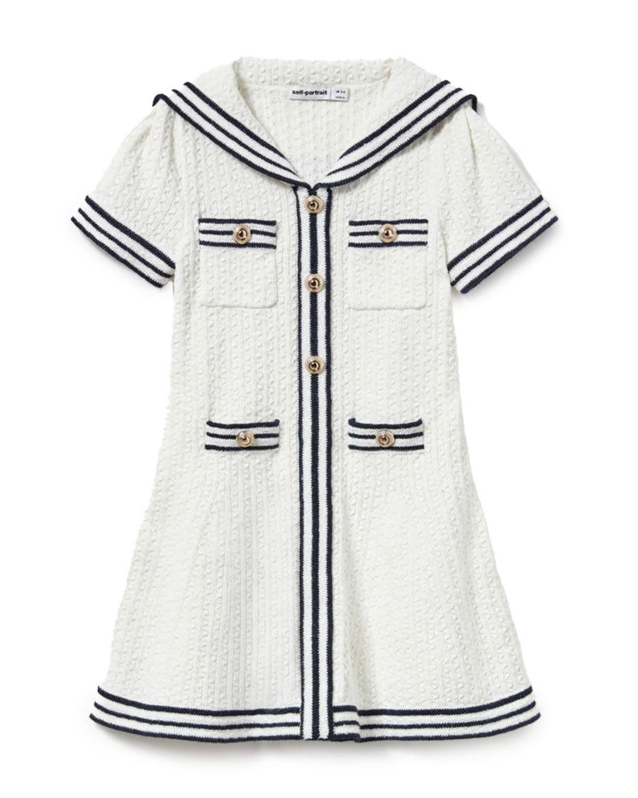 A preppy look for your mini me, this textured knit dress features a large fold collar and gold button detailing. Pair its romantic accents and full skirt with Mary Janes and a matching headband.
