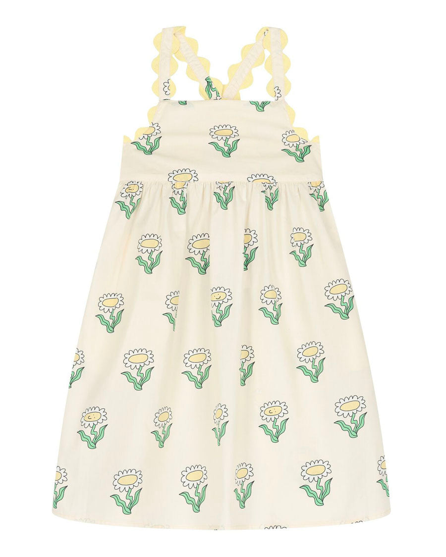 A pretty cream dress by British designer Stella McCartney. Made from soft cotton with an all-over happy daisy print. The lightweight dress features crossover straps at the back, yellow embroidered scalloped trims, and side pockets for added practicality. It fastens with a concealed zip on the side for easy dressing.