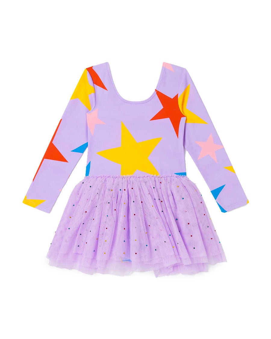 Star Print Tulle Skirt Long-Sleeve Dress - Purple