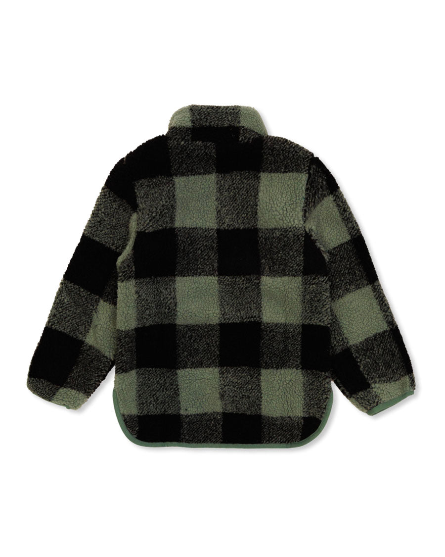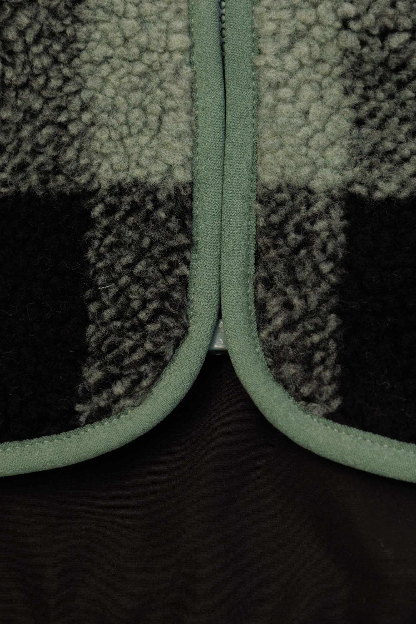 The bold oversized plaid, rendered in deep shades of green and black, introduces a playful yet sophisticated charm. A standout chest pocket, adorned with a vibrant orange flap and zip closure, showcases the brand’s embossed logo—an exclusive mark of its distinguished design lineage. The vertical front zipper gracefully echoes the jacket’s clean, practical aesthetics.