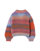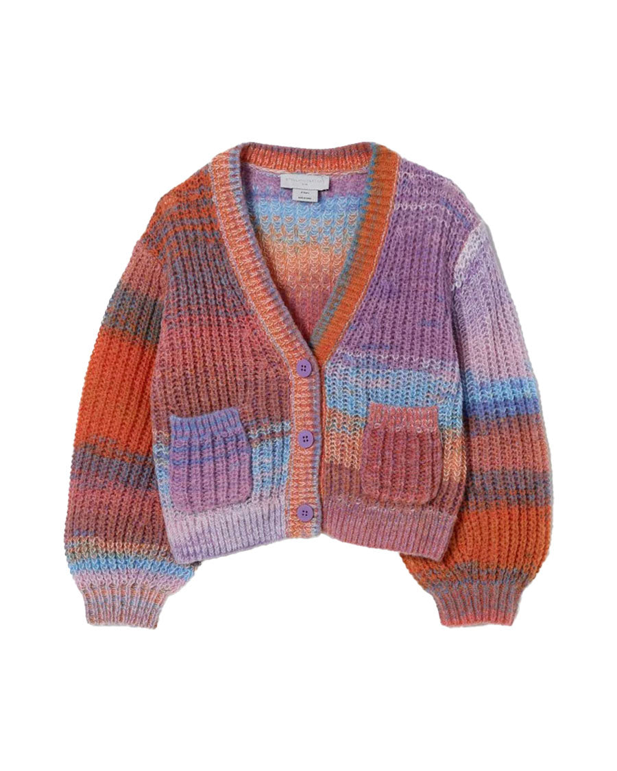 Stella McCartney Kids crewneck cardigan in multicolor knit with a gradient effect. Features balloon sleeves, V-neck, button closure, side pockets, and ribbed edges.