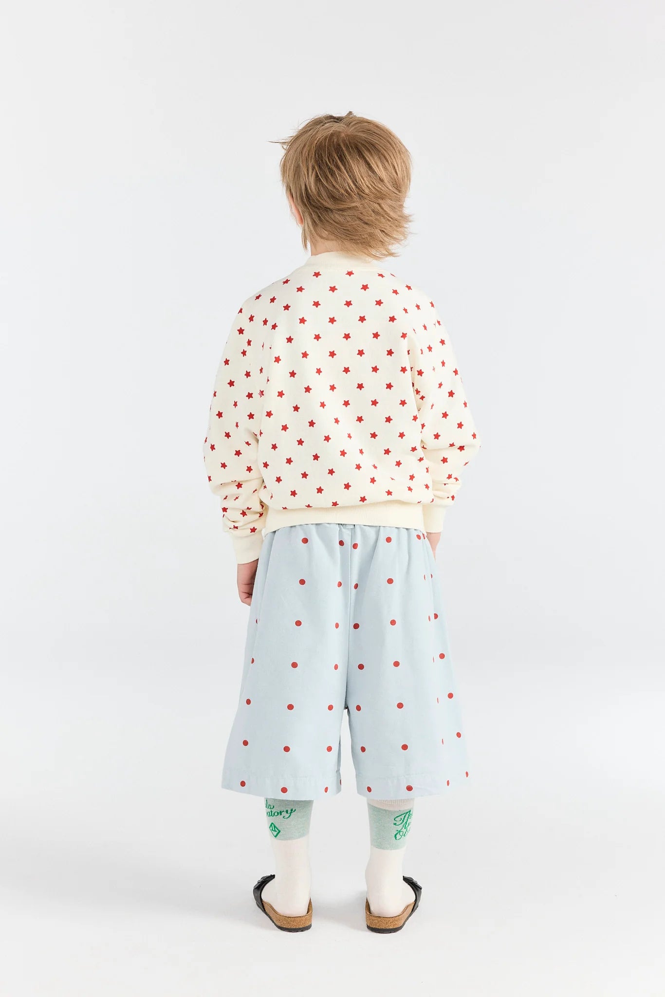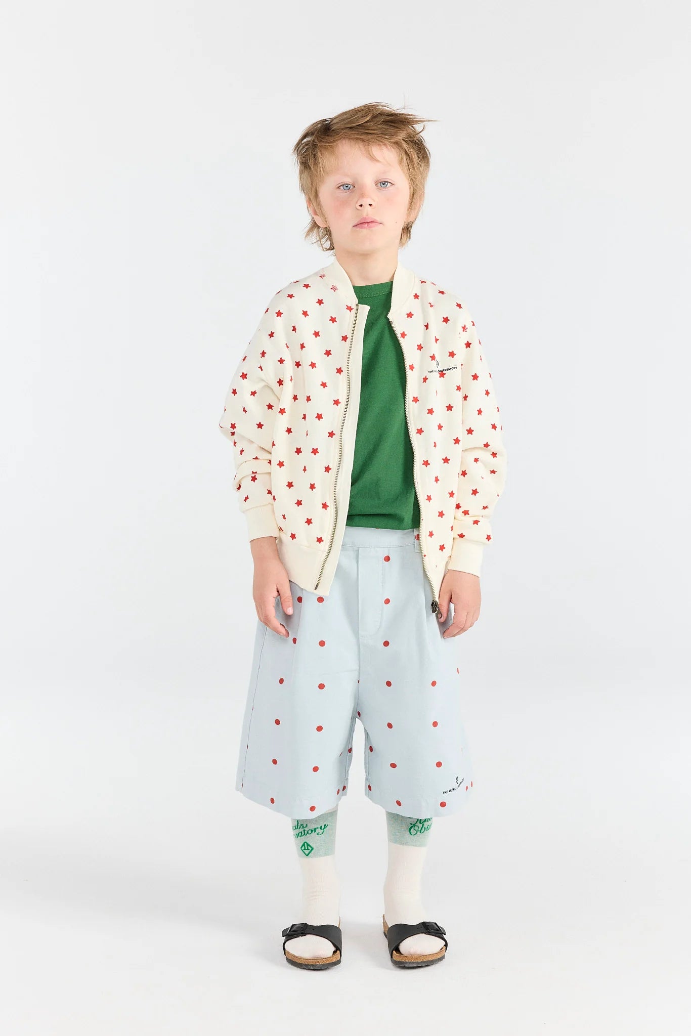 This raw white zip-up track jacket covered in red stars and finished with a subtle logo detail on the chest and back adds playful energy to kids clothes collections. It offers a perfect fabric for summer with unbrushed fleece.