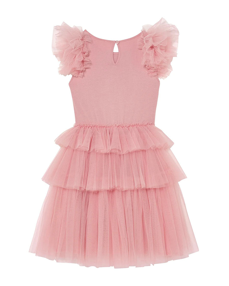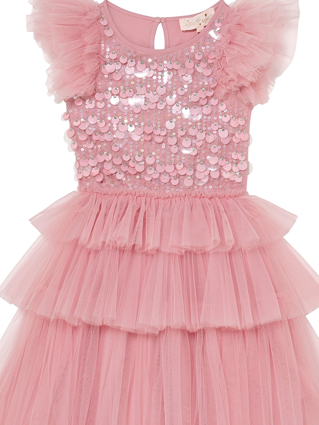 A playful masterpiece, the Daphne Dress in Peach Blush is a celebration of volume and shimmer. Its tiered tulle skirt flows with effortless movement, while oversized ruffle sleeves create a striking, bold silhouette. The bodice is adorned with a dazzling array of sequins and larger sequin discs, catching the light in every direction.