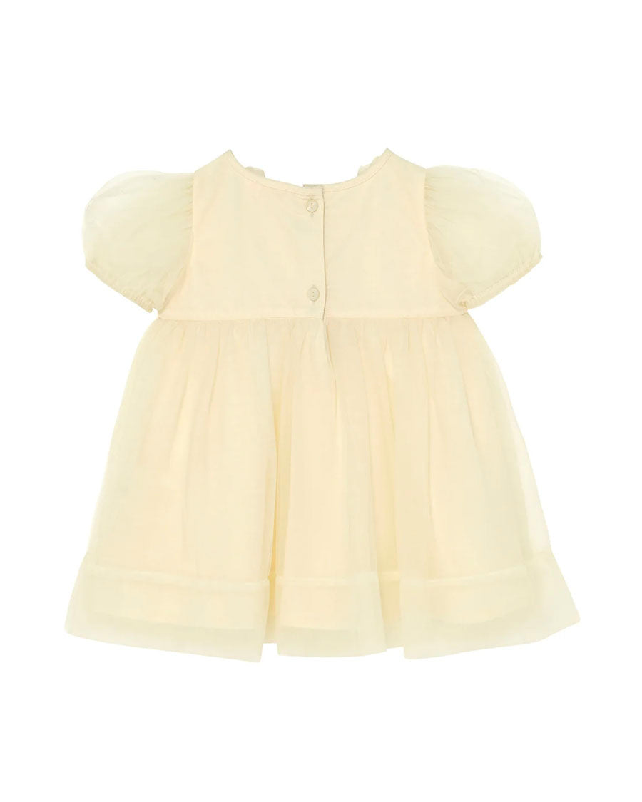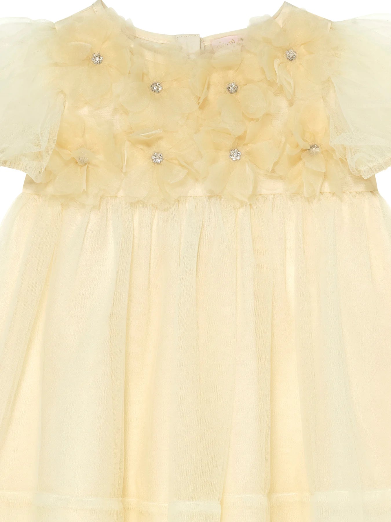 Unveil a world of floral enchantment with our Bébé Camellia Tulle Dress in Daffodil. This dress features delicate tulle balloon sleeves and a graceful full A-line skirt that flows with every step. The bodice blooms with handcrafted organza flowers, each adorned with a cluster of shimmering gems, creating a stunning garden of blooms that will make your little one feel like she’s wandered into a fairy-tale world.