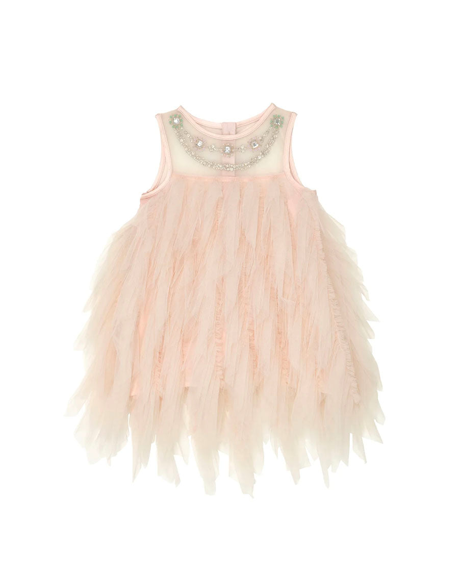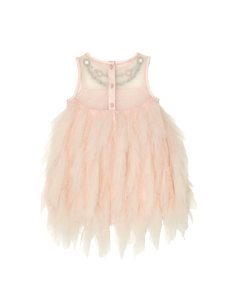 The Bébé Gilded Splendor Tutu Dress in Pearl is for the little girl who loves to embrace the magic of the moment. With its cascading waterfall-feathered tulle skirt, where every twirl tells a story, the A-line design ensures comfort without compromising on elegance. The front yoke, sparkling with crystals, resembles a beautiful necklace, adding an extra layer of magic. The sheer back yoke provides a delicate touch, making this dress as comfortable as it is enchanting.