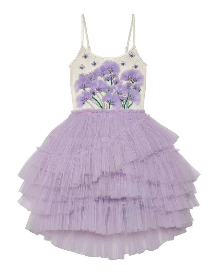 Let your little one blossom in our Lavendar Lounge Tutu Dress in Pastel Lilac Mix! The full crisscross style tulle skirt flutters with every step, while whimsical floral embellishments with beaded stems add a touch of nature-inspired magic. Frayed organza creates a dreamy effect, evoking the look of sprouting lavender swaying in a gentle breeze.
