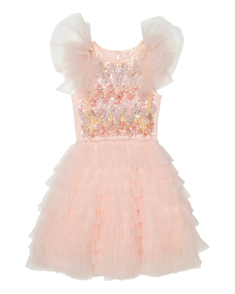 Add a touch of fairy-tale magic to her wardrobe with the Sugar Fairy Tutu Dress in Pearl! The tank-style bodice is adorned with dazzling embellishments, capturing the light like a sprinkle of fairy dust. Whilst a multi-tiered skirt and fluttery tulle ruffle sleeves complete the look, capturing the magic and sweetness of a fairy-tale fantasy!