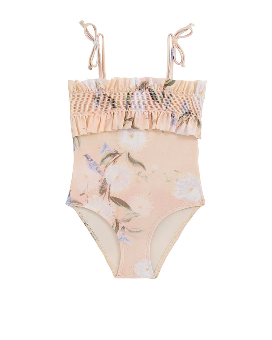 The Cascadian Kids Shirred 1PC in Cream Botanical Floral from our Summer Swim 2025 Collection. A kids one piece swimsuit featuring fixed bow tie shoulder straps, shirred bodice and frilled edges.